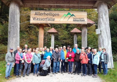 Unser erstes Ziel, die Schwarzwälder Schinkenräucherei in Herzogsweiler. Bei einer Führung erfuhren wir vieles über das traditionelle Handwerk. Weiter über Freudenstadt und die Schwarzwaldhochstraße nach Ottenhöfen. Am Nachmittag im Nachbarort Kappelrodeck konnten wir bei einer Edelbrennerei Schwarzwälder Spezialitäten probieren. Eine Gruppe erwanderte am Samstag den Oberkircher Brennersteigm durch Weinberge und Obstbaumanlagen an mehreren Brennereien vorbei, konnten wir „Wässerchen“ und Liköre an Raststationen gegen einen Obolus testen. Herrliche Aussichten in die Herbstlandschaften wurden geboten und vom Geigerskopfturm hatte man eine wunderbare Sicht ins Rheintal. Unser Höhepunkt war wie immer das gemeinsame Wander-Buffet. Es jeder brachte das mit, was Küche und Garten hergab. Es war für jeden was dabei. Die zweite Gruppe machte sich mit dem Zug auf den Weg nach Achern. Dort gab es auf dem Krämermarkt neben einheimischen, auch sehr viele internationale Produkte. Am späten Abend wurden wir mit Musik verwöhnt. Die „Huatlupfer“ spielten auf. Der Sonntag wurde wieder mit sonnigem Wetter eingeläutet. Da konnten wir die Tour zum Allerheiligenwasserfall genießen. Es wurde auch der Lotharpfad besucht. Nach einer Vesperpause steuerten wir den Mummelsee an und beendeten dort den Besuch im Schwarzwald mit der obligatorischen Schwarzwälder Torte.